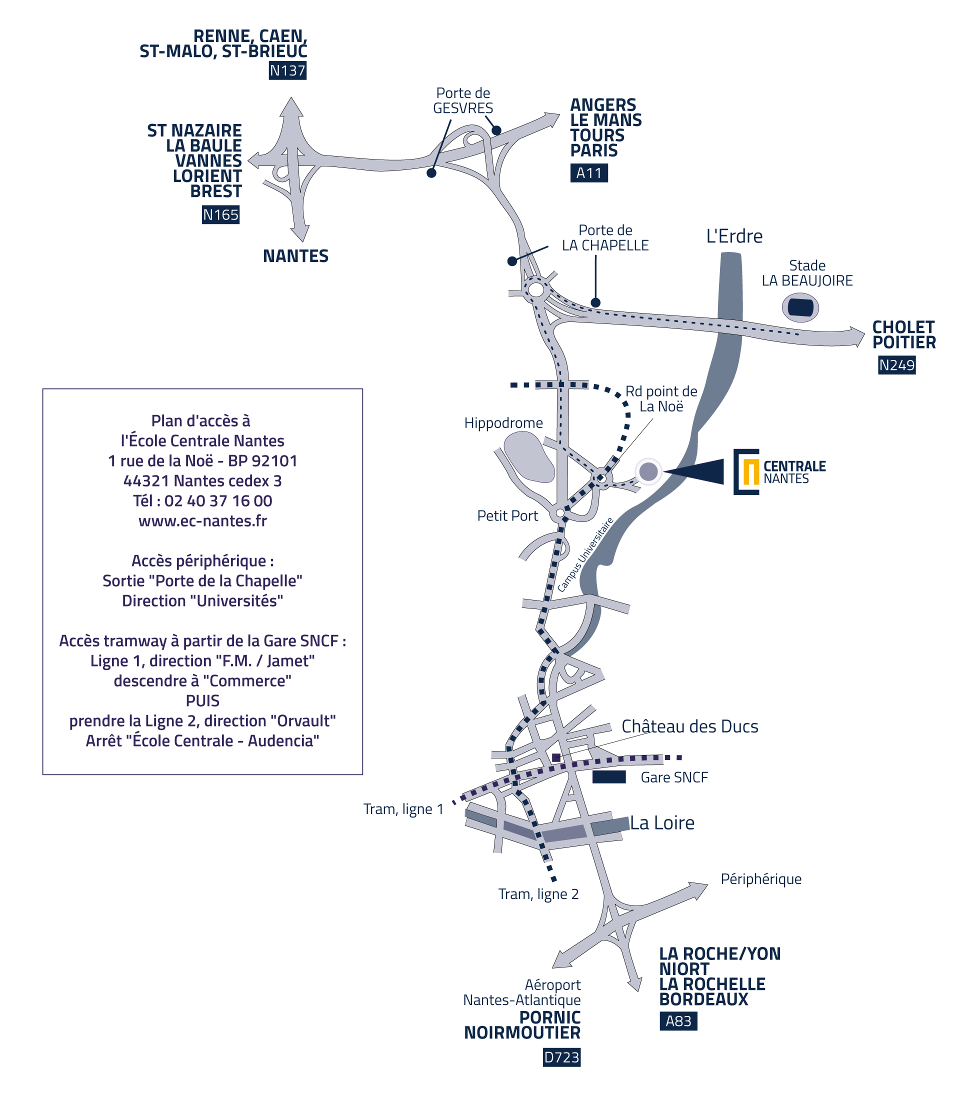 From the north exit of the station, take the tram line 1, direction F. Mitterand. Get off at the stop Commerce. To get to Centrale Nantes, take tram Line 2, direction Orvault Grand-Val, and get off at the stop Ecole Centrale/Audencia. Centrale Nantes is close to the tram stop. One ticket costs €1,90. It is valid for one hour after you stamp it and can also be used on the regular bus and trams. Most of the university residences are located two tram stops after Ecole Centrale/Audencia. From the airport Nantes Atlantique international airport is situated about 10 km southwest of Nantes. There is a Tan air bus which will take you downtown (either to the train station or to Place du commerce). From the north exit of the station, take the tram line 1, direction F. Mitterand. Get off at the stop Commerce. To get to Centrale Nantes, take tram Line 2, direction Orvault Grand-Val, and get off at the stop Ecole Centrale/Audencia. Centrale Nantes is close to the tram stop. One ticket costs €1,50. It is valid for one hour after you stamp it and can also be used on the regular bus and trams. A taxi from the airport (the easiest option), will cost about €50.